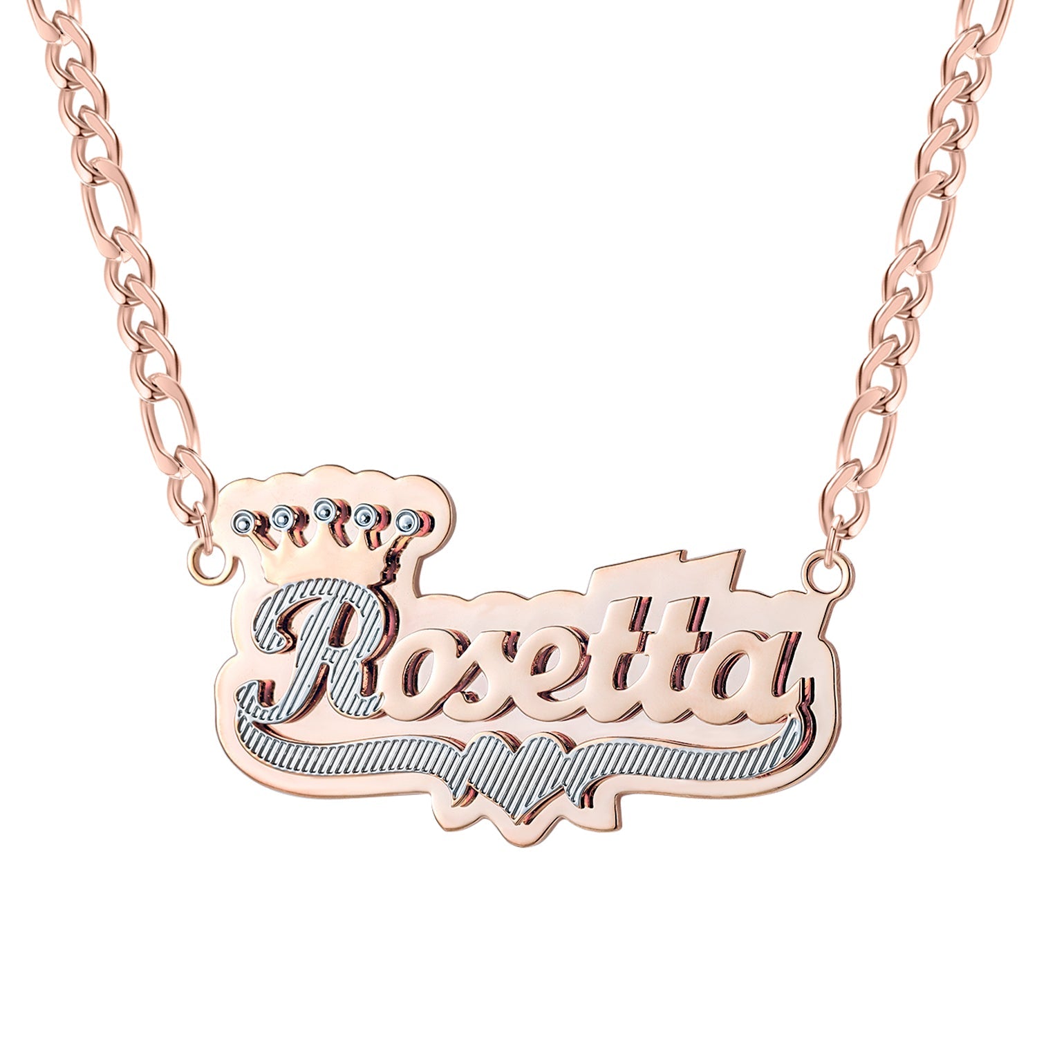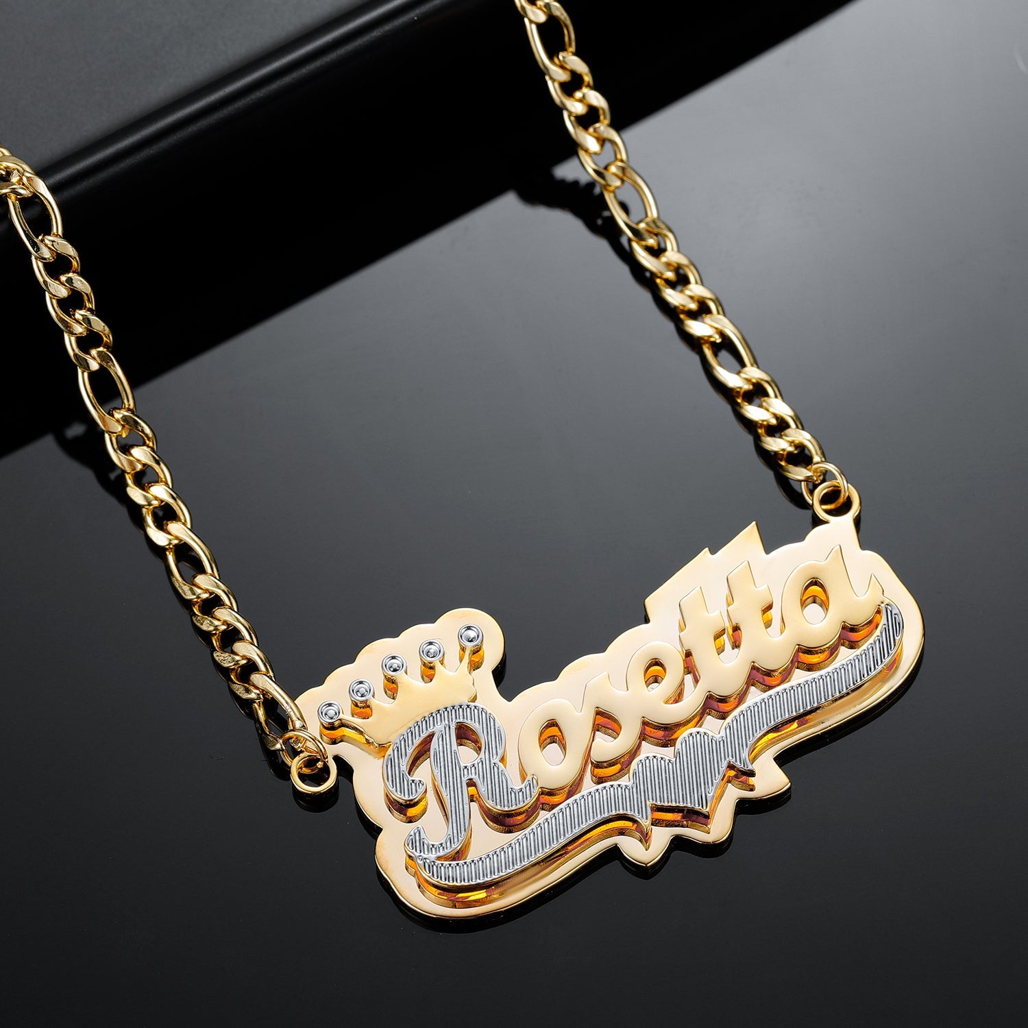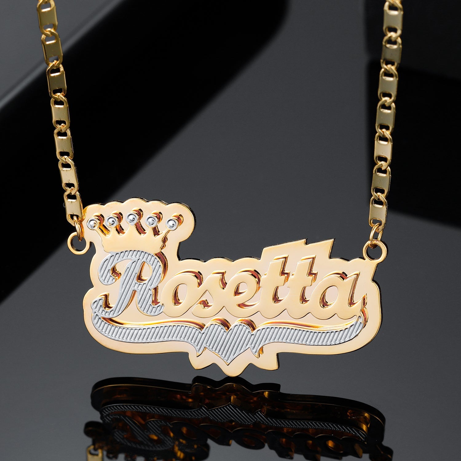 Introducing the Full Back Crown Name Necklace, an exquisite two-tone name necklace that pairs a gold-filled back with a crown on the first large letter. Personalize it with your name to make a perfect accessory for any occasion. Crafted with quality materials and attention to detail, this unique necklace is sure to stand out.