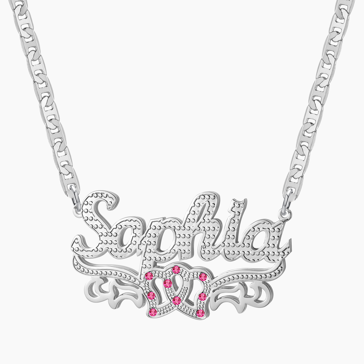 Show off your unique style with this beautiful double plated name necklace. It is handmade with care and features a stunning pink rhinestone heart detailing, creating an eye-catching piece that will last for years. The perfect gift for yourself or someone you love.