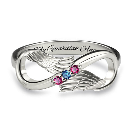 Engraved Angel Wings Infinity Ring with Birthstones Silver